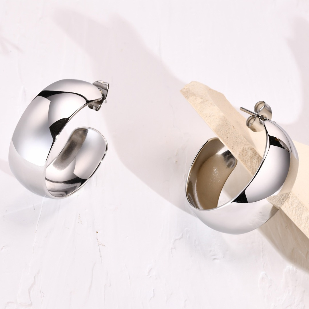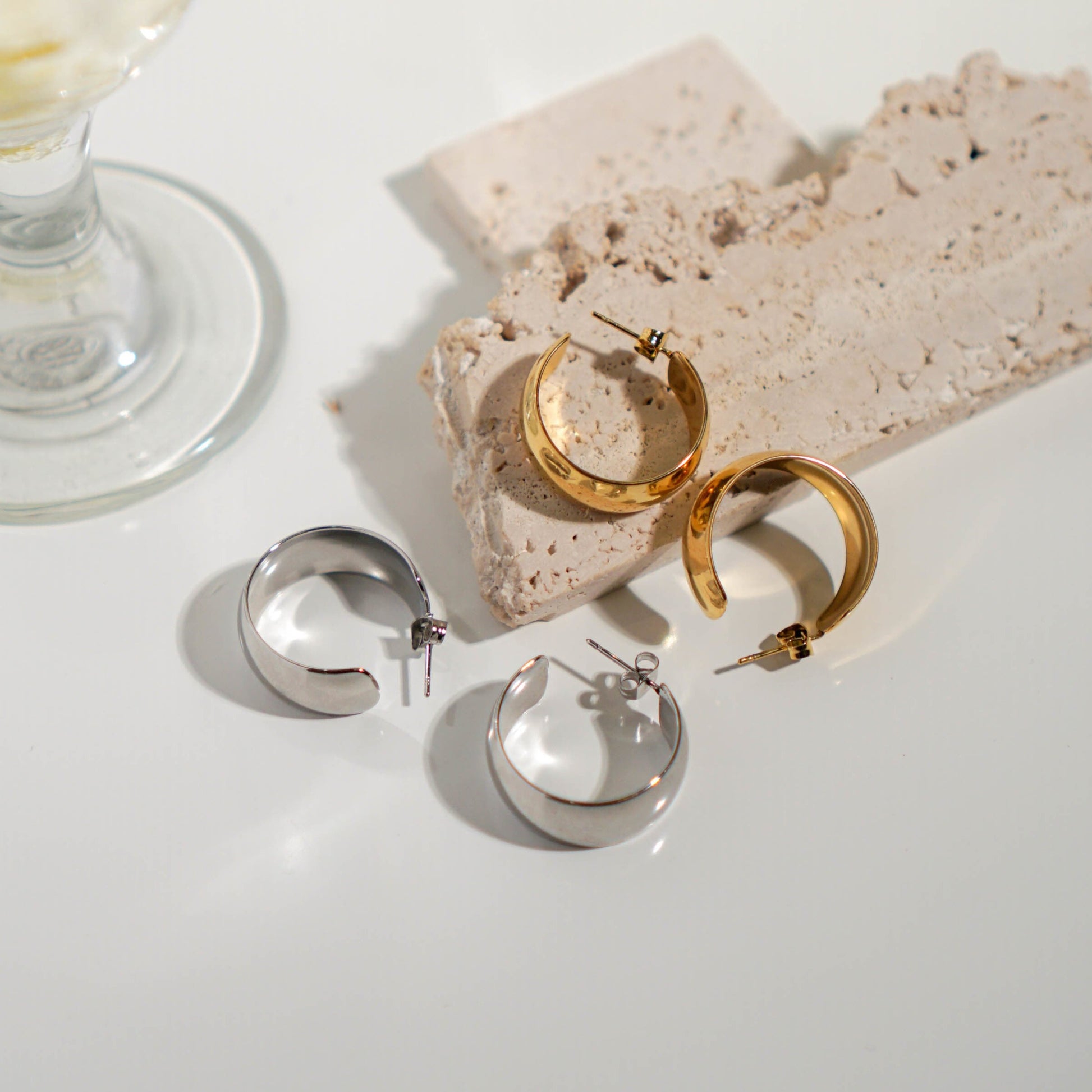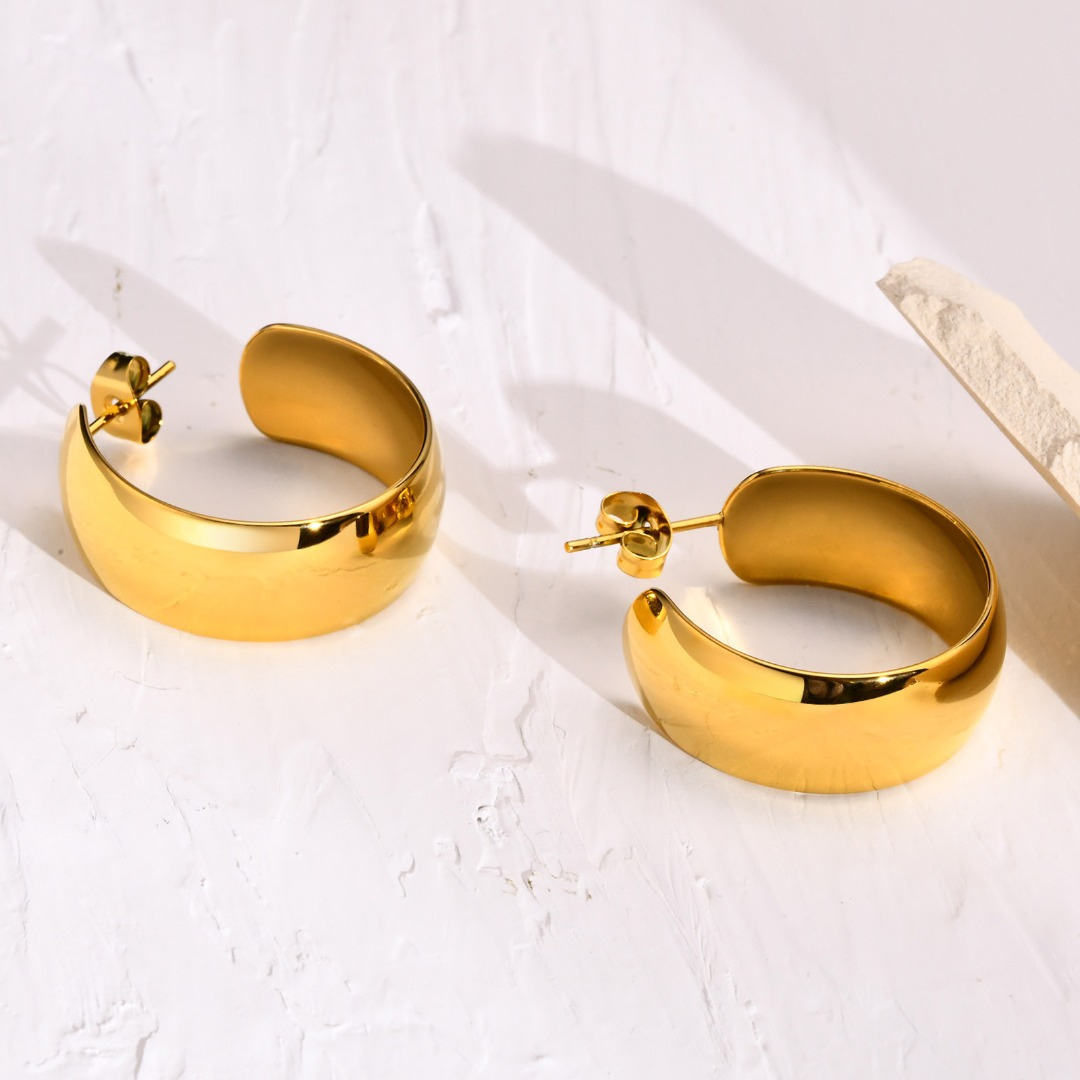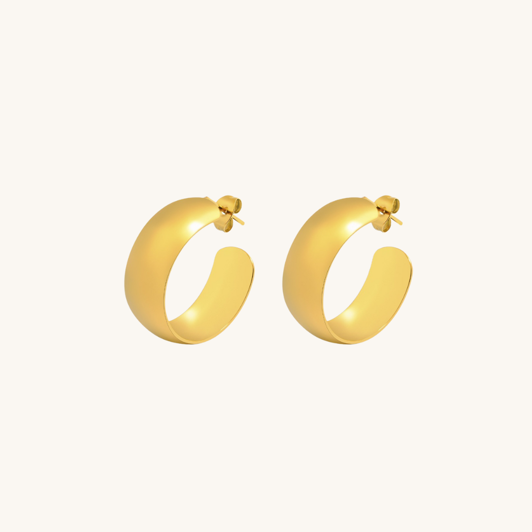 You can never go wrong with this pair of gold hoop earrings with a high-polish texture and hypoallergenic titanium posts. Carefully crafted and dipped in 18k gold, these classic gold hoops are meant to be worn every single day by a confident and chic woman. Score bonus styling points by pairing these gold hoop earrings with a thin gold collar.