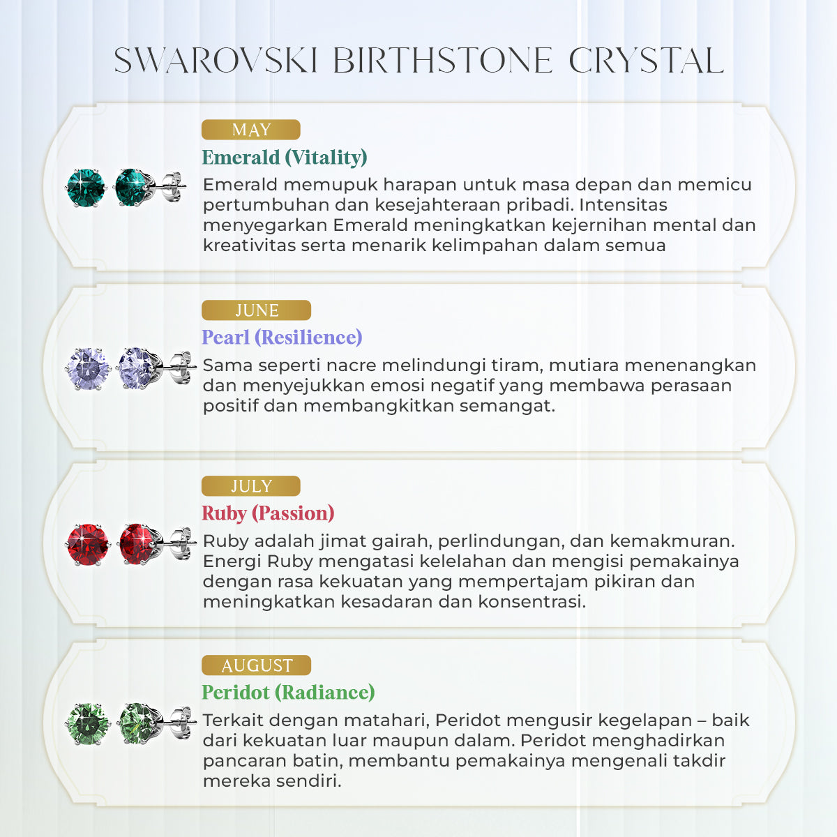 Petite studs for the win – these adorable birthstone earrings features certified Swarovski Crystal symbolising every birth month's colours. These elegant earrings are crafted in 925 Sterling Silver and layered with Rhodium plating. Made for pierced ears, these birthstone crystal earrings are hypoallergenic. Pair it with the matching Birthstone Swarovski earrings for a cohesive look. Wear these classic birthstone earrings to add a pop of colour to your outfit.