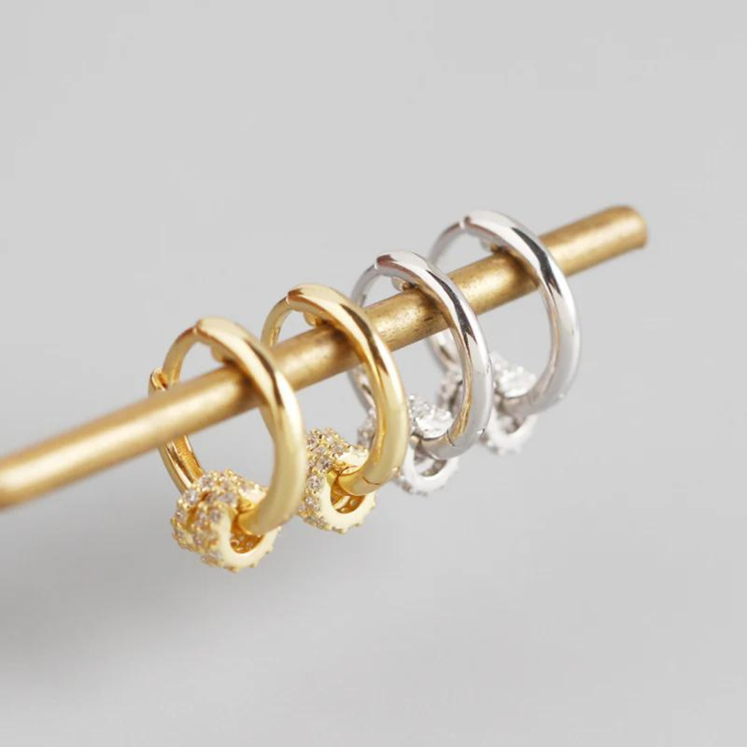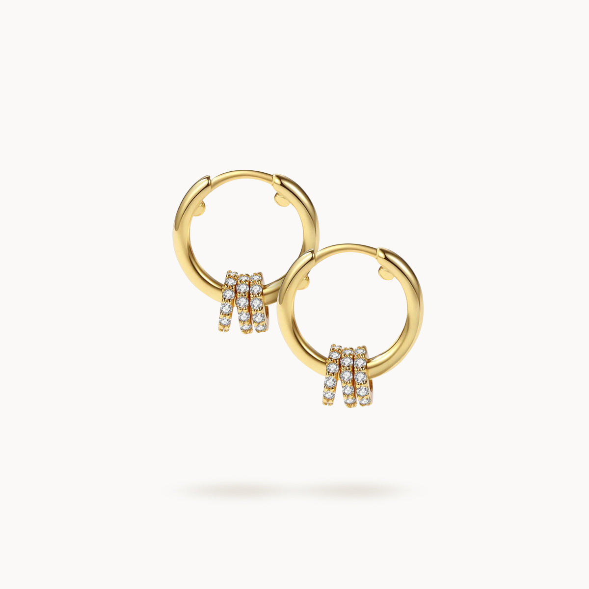 These trio ring huggie hoops are a pair you'll keep forever. These earrings crafted in 925 Sterling Silver and dipped in 18K gold showcase a row of three shimmering rings in the middle. Designed to be worn every day, these cali trio ring hoop earrings are perfect to pair with the other studs.