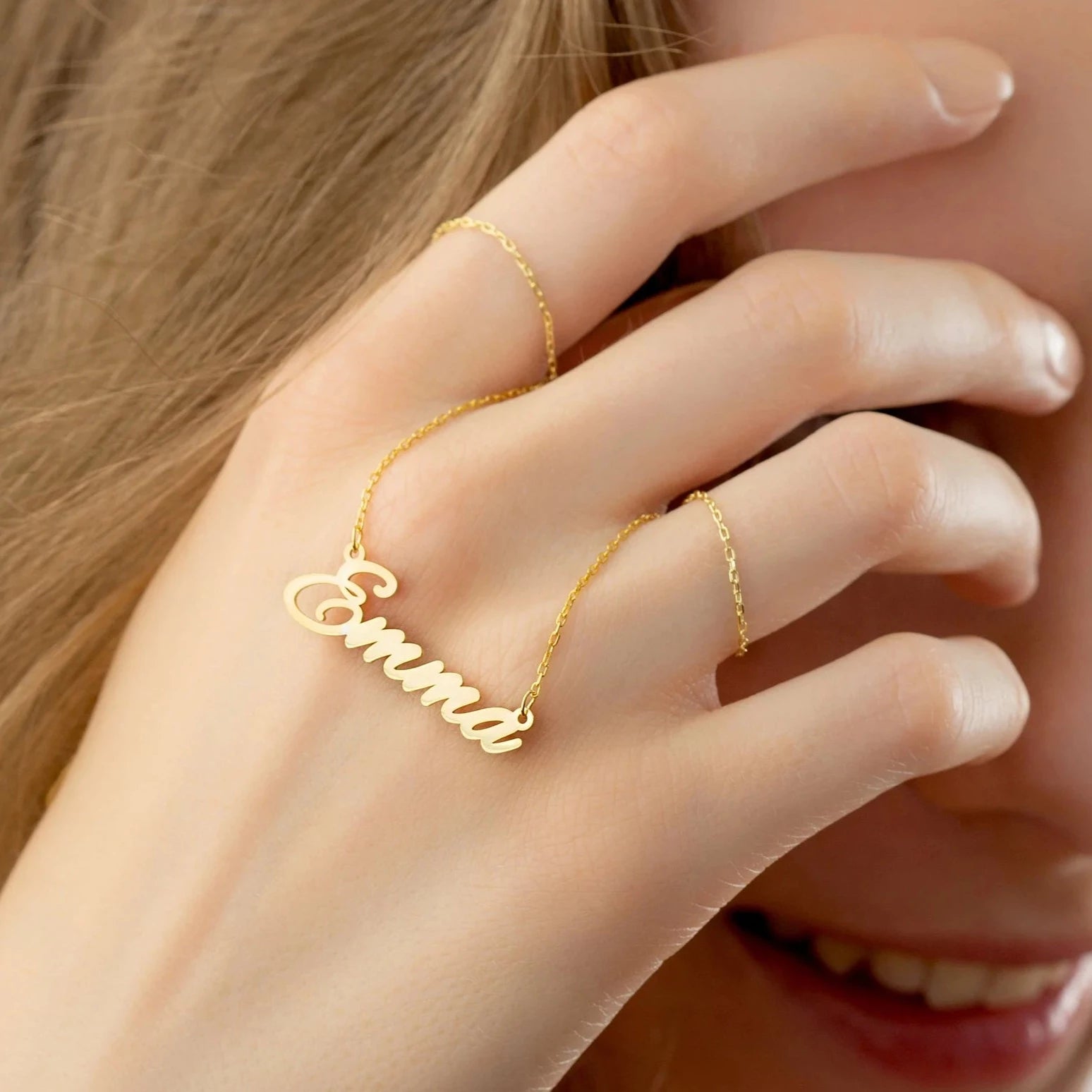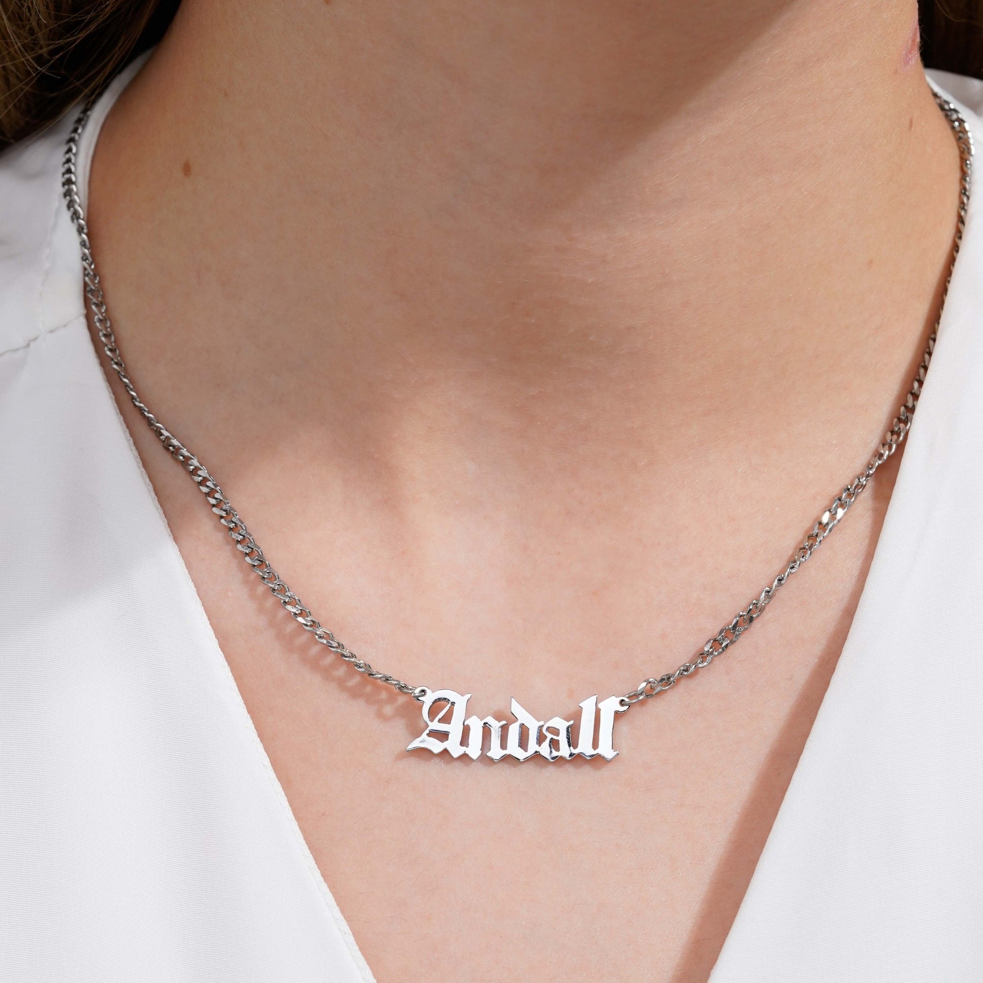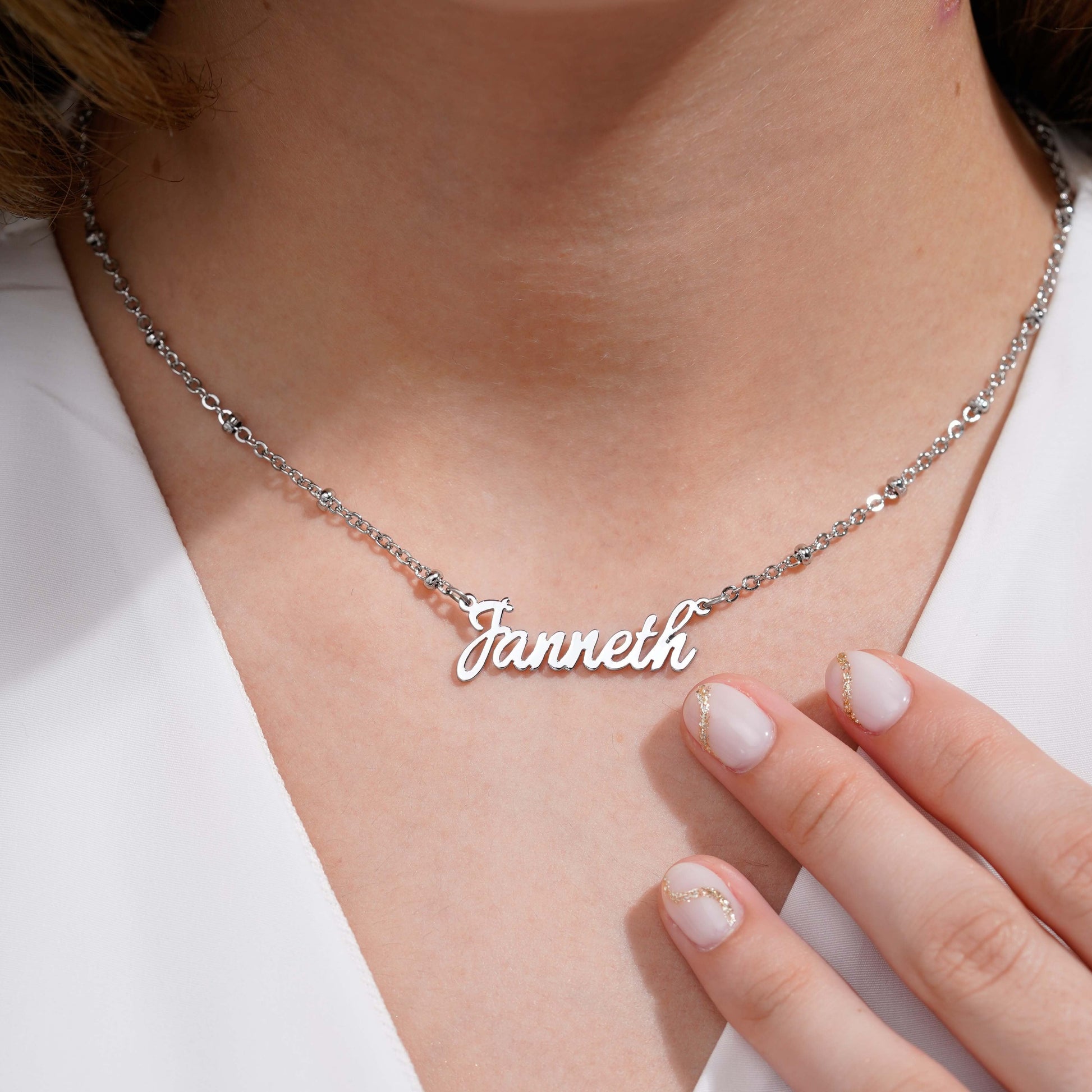 This classic and timeless name necklace crafted in stainless steel and dipped in 18K gold features a chain of your choice. Effortlessly chic and dainty, this name necklace makes the perfect gift for yourself or your loved ones. Wear this necklace alone or layered with your favorite chain necklace.