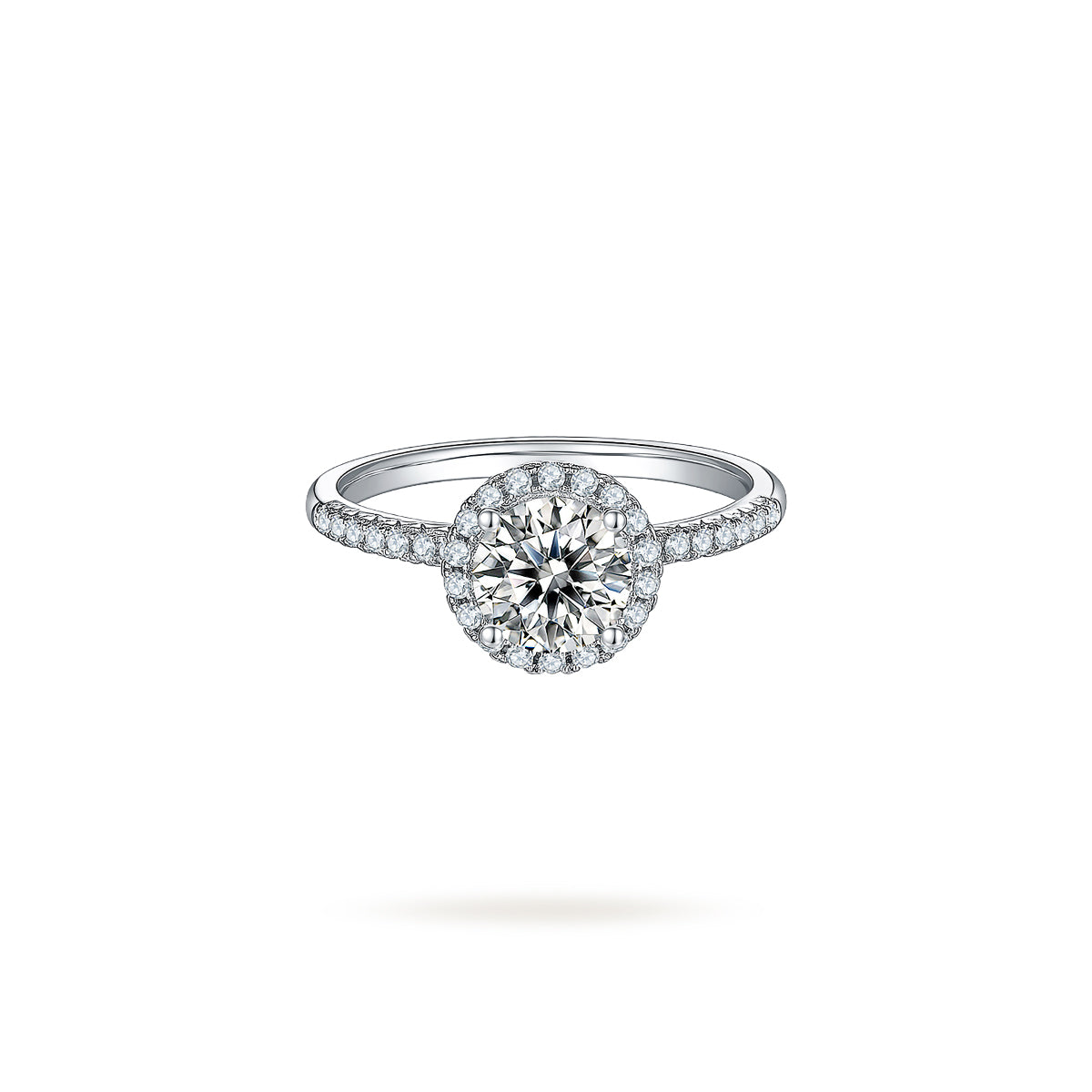 Inspired by our life-long love of diamonds, our Icon setting Diana ring in white gold is designed to intensify the fire and luminosity, with the brilliance of the central round brilliant cut diamond enhanced by a gleaming pavé Cubic Zirconia halo. Each CZ gem is individually crafted to accentuate its innate natural beauty, while each bespoke setting is shaped by our master craftsmen to cradle the unique silhouette.