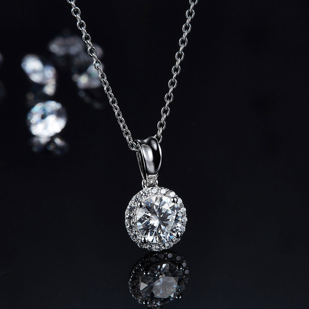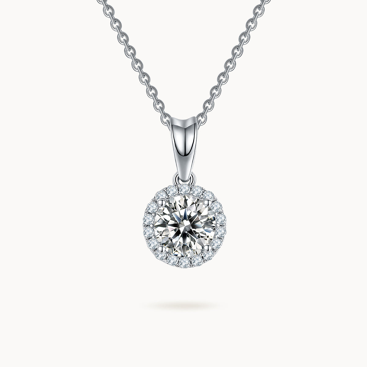 From the Classic AndAll collection, our round diamond Icon pendant is designed to be exactly that: iconic. The ultimate day-to-night jewel, it showcases a spectacular round Moissanite clasped within a fine halo of pavé stones. Exuding timeless elegance, each Moissanite diamond precisely matched for colour and clarity, and set with the upmost precision. Presented on a delicate white gold chain, the minimal white gold setting is finely crafted by our master craftspeople to allow maximum light to dance within the entrancing central stone.