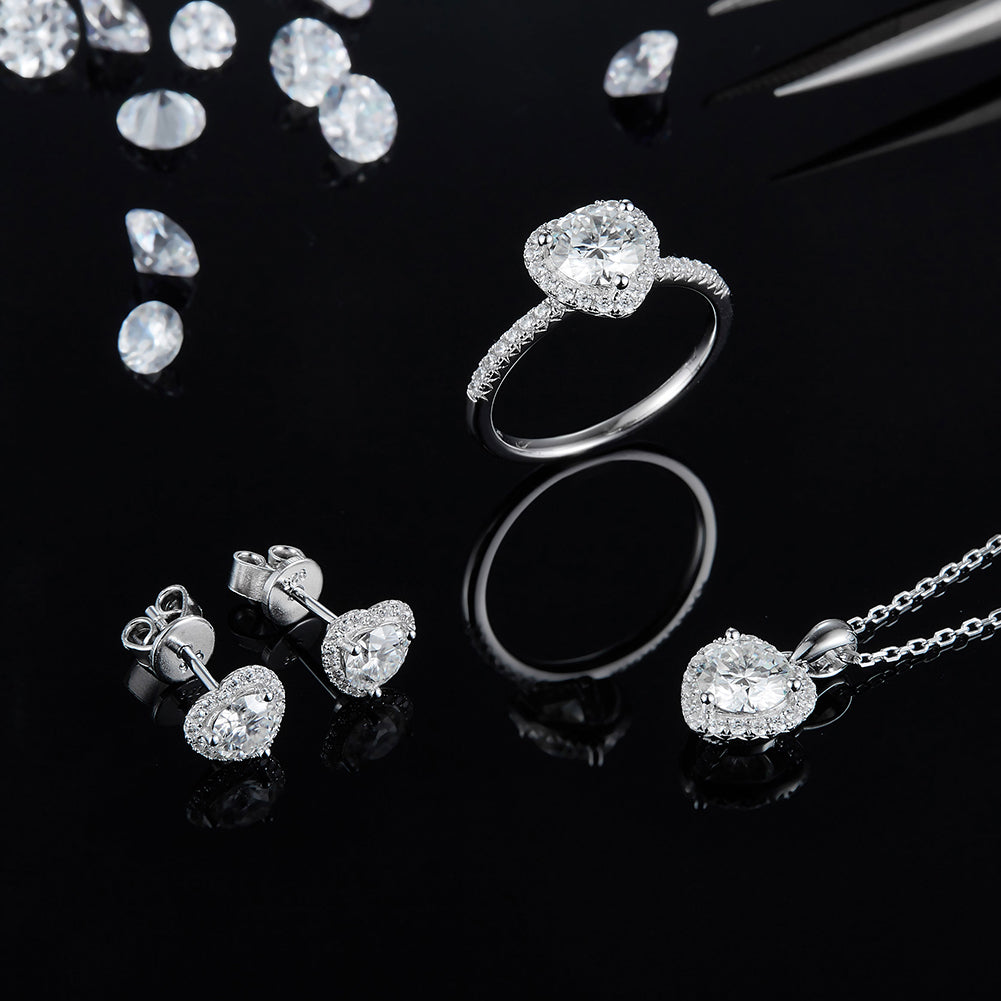 Components: White Gold on 925 Sterling Silver, Moissanite Gems, Cubic Zirconia Stones