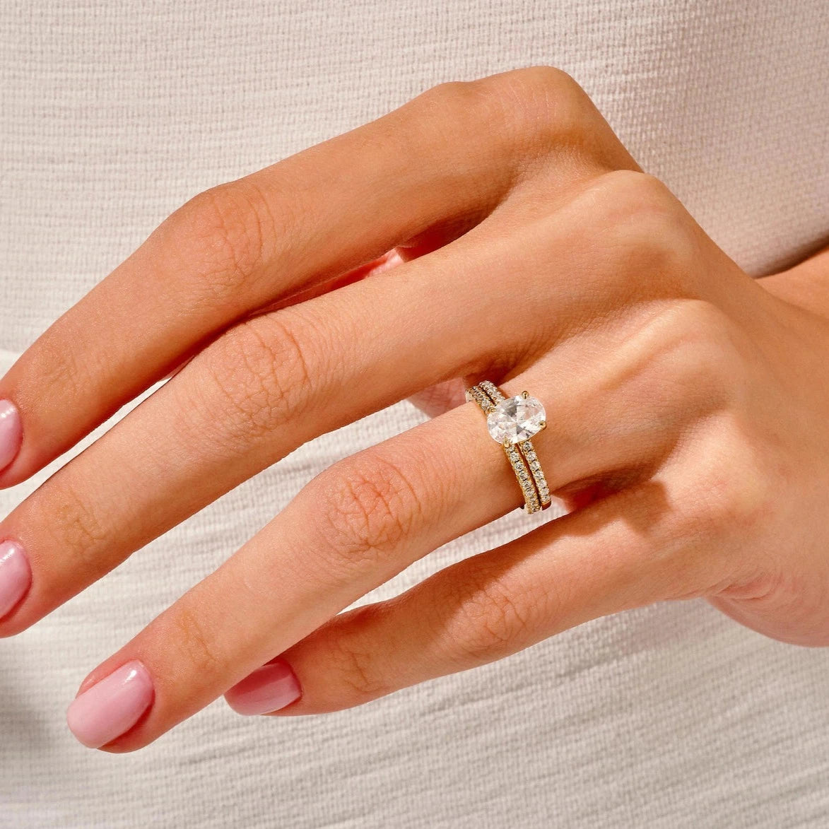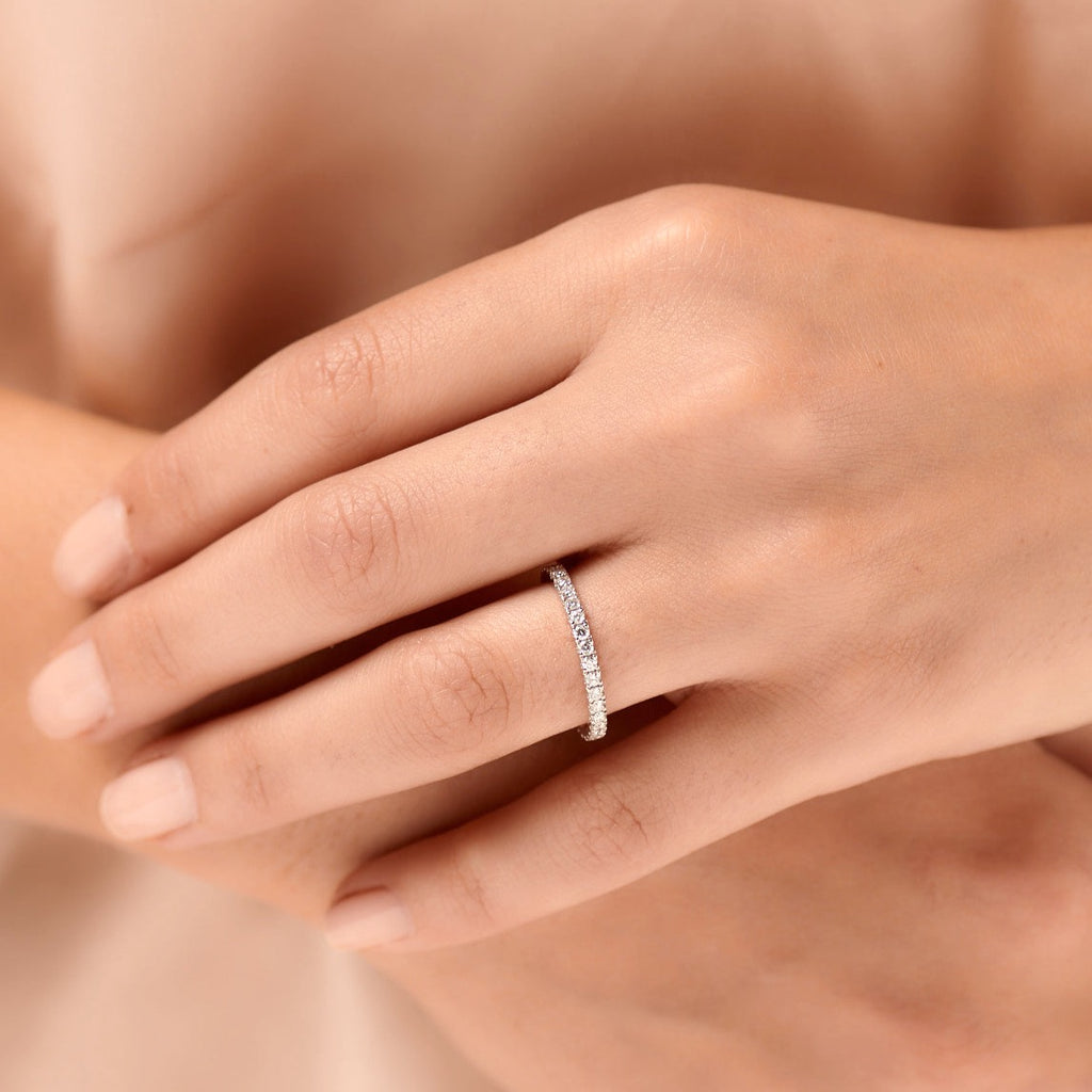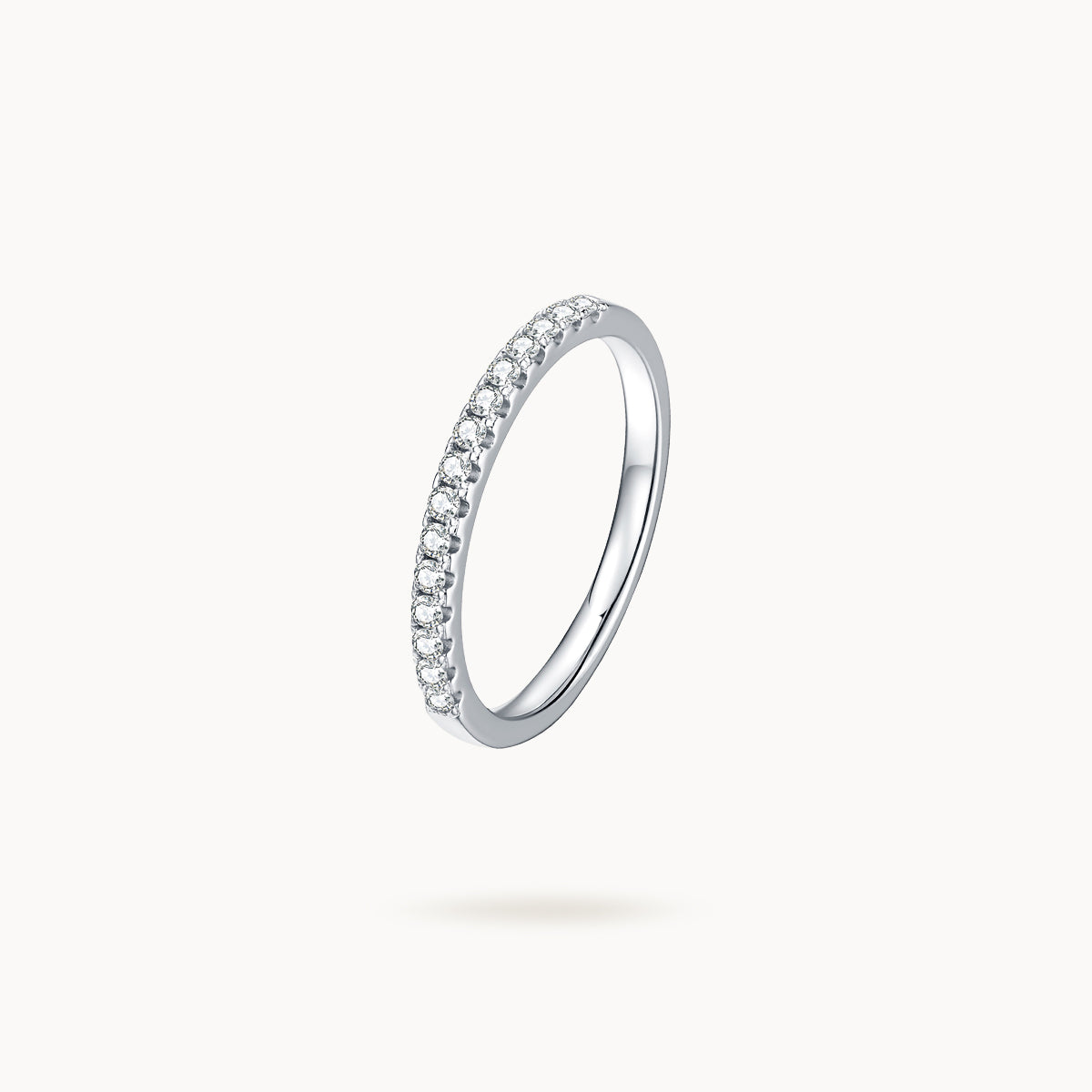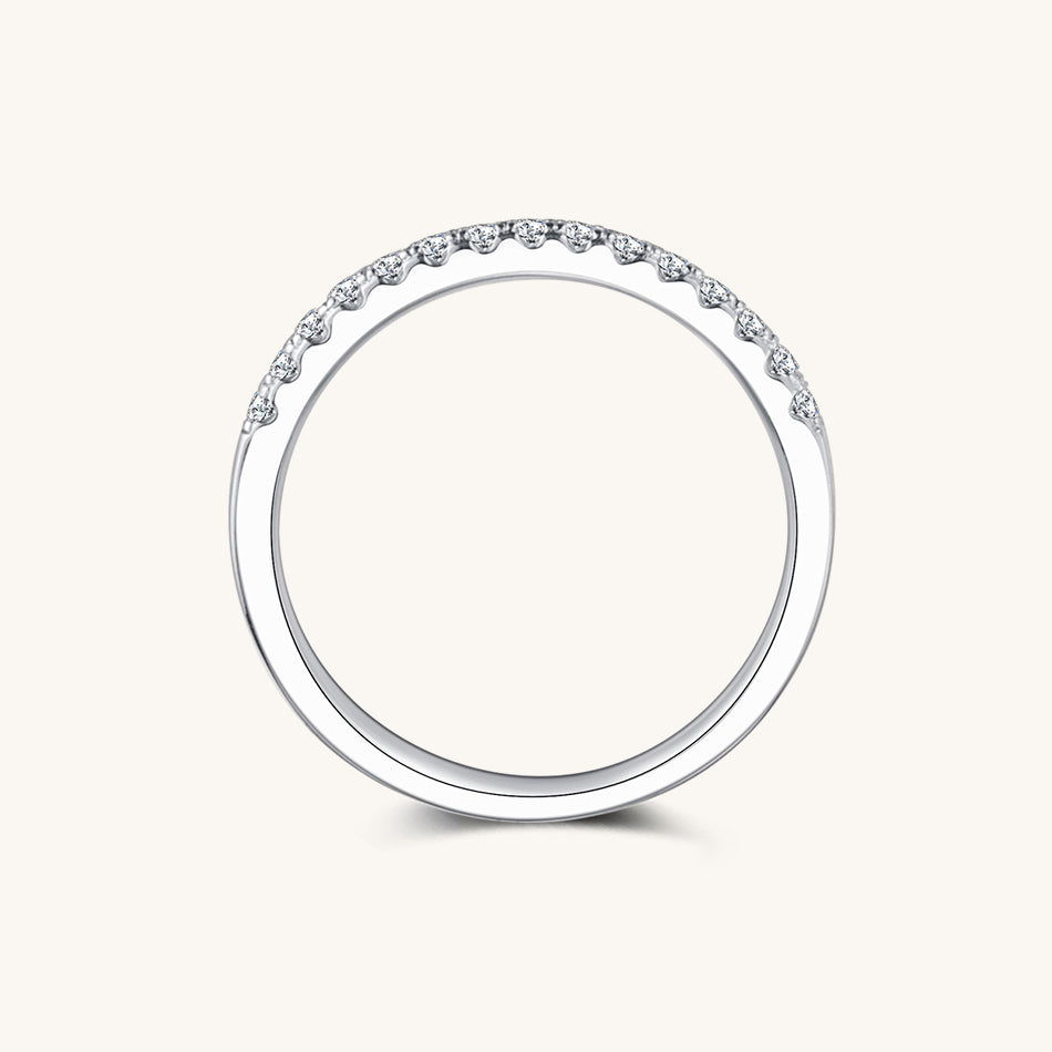 Shop this petite diamond ring features scalloped pavé diamonds in elegantly sculpted prongs that extend three-fourths of the way around the band, leaving a small sizing bar in back. It is a beautiful complement to many delicate engagement rings.