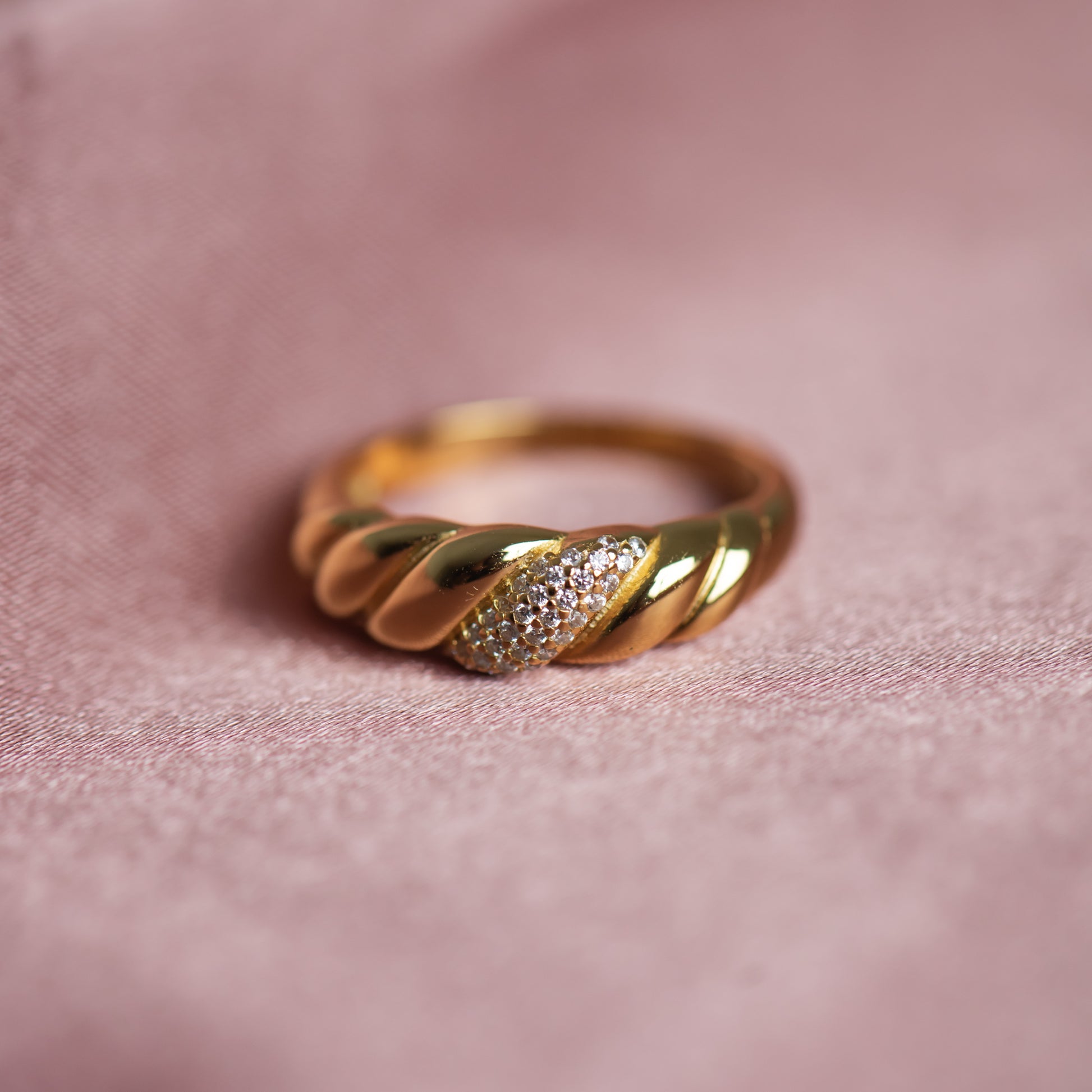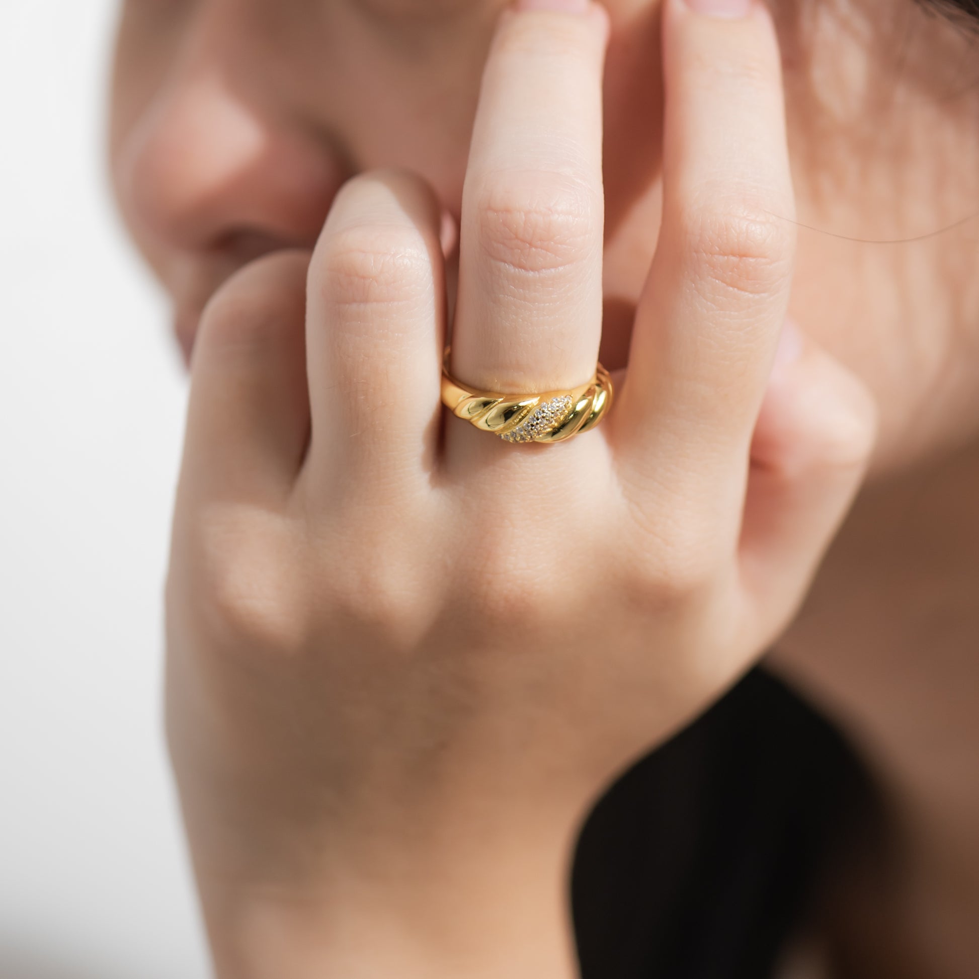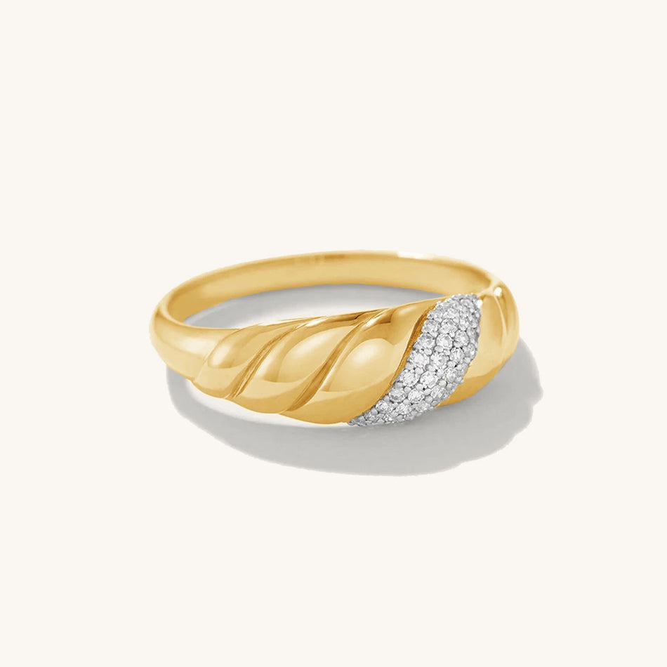 Its time to bring our inner French. Featuring aĀ chunkyĀ twisted band, this croissant-inspired ring will make all your Parisian dreams come alive. Easily worn alone as a statement piece or layerable with other stacking pieces, this gold twisted ring is the quintessential of your ring collection. Handcrafted in 925 Sterling silver and layered with a 18K gold layer, this gold twist ring screams chic. Match it with the croissant dome earring for a cohesive look.Ā