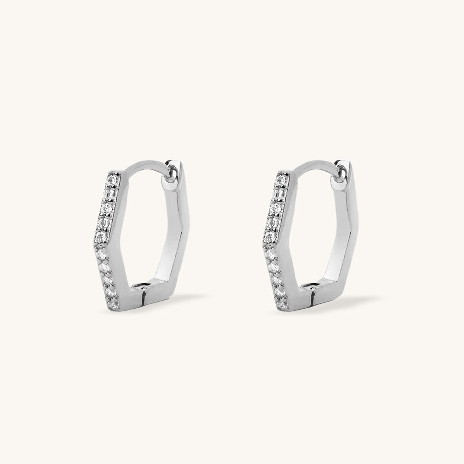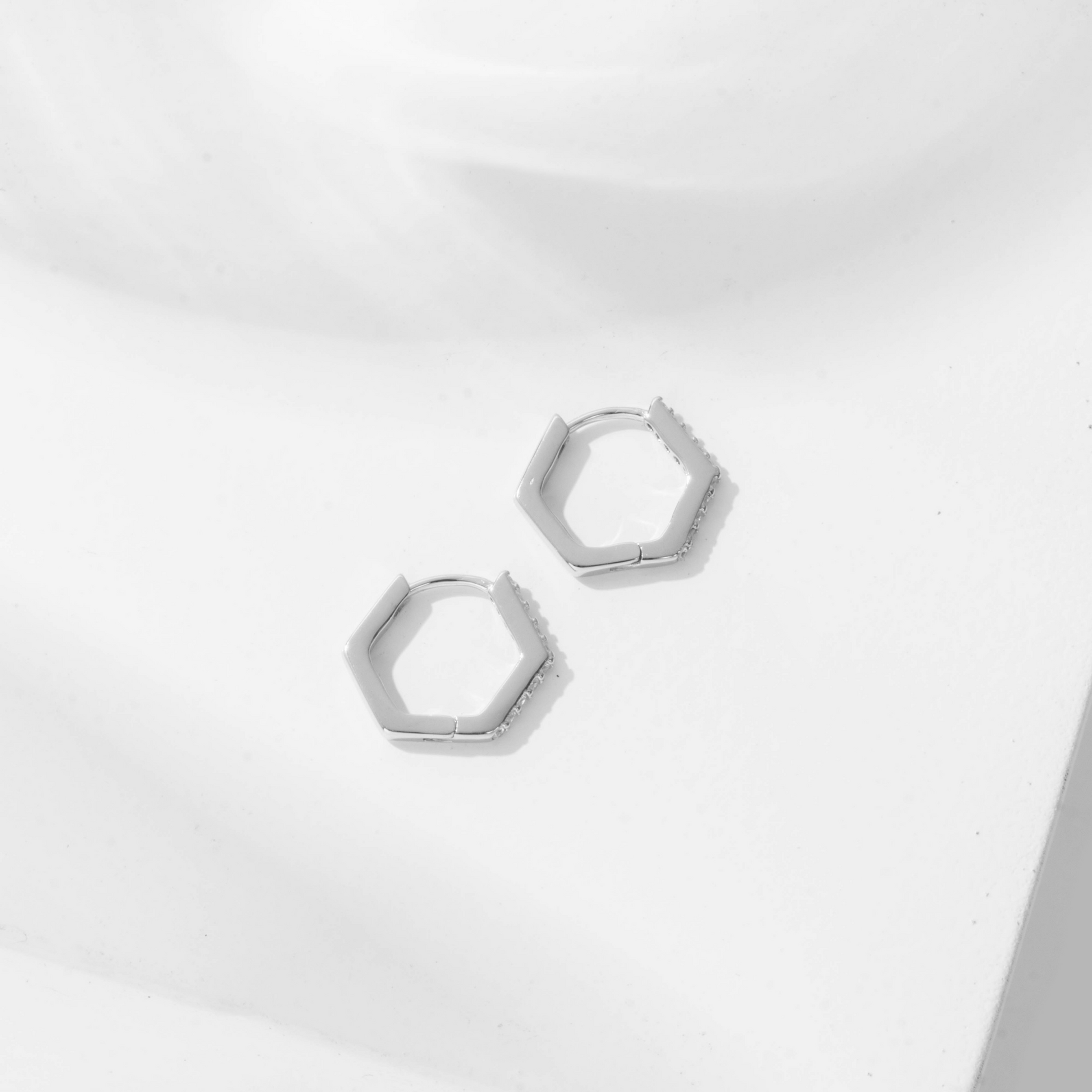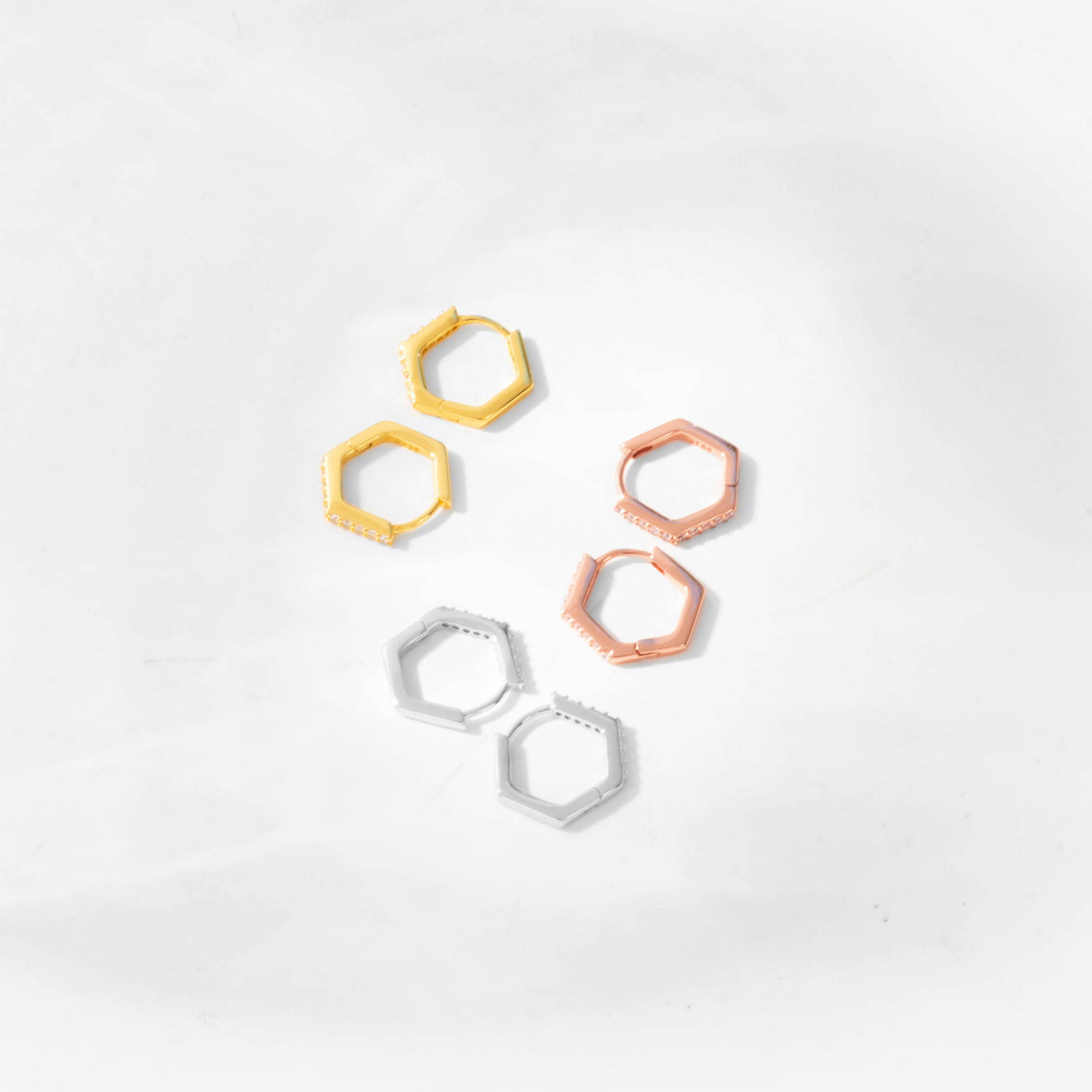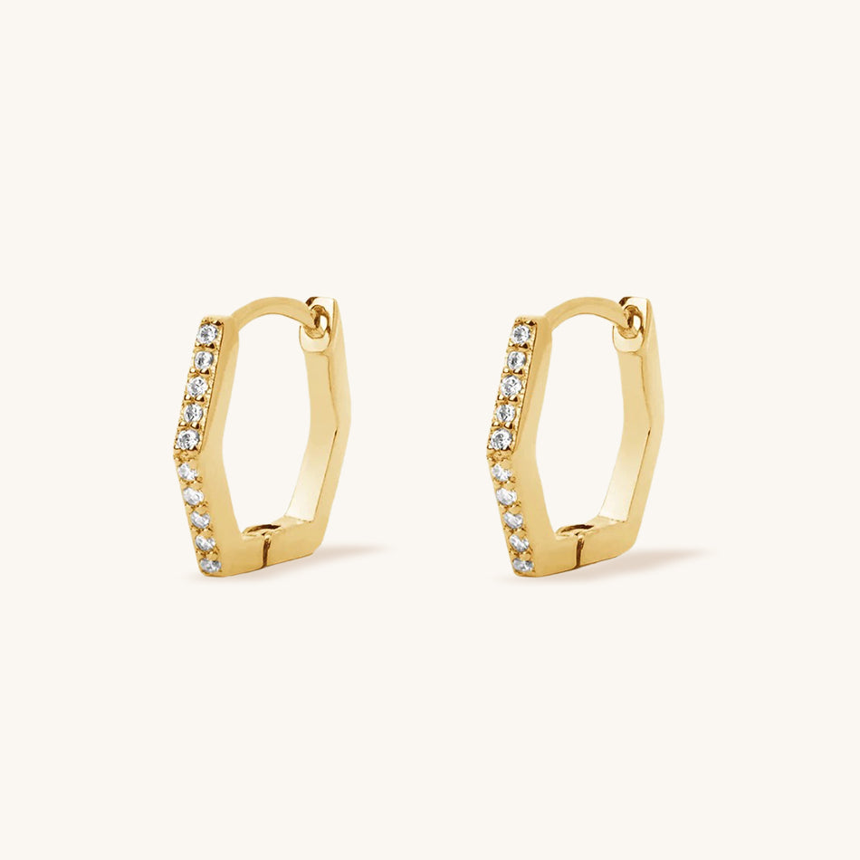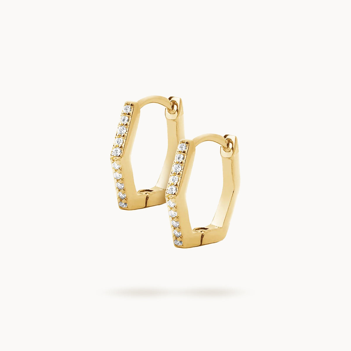 These modern sparkling hoops feature 11 Cubic Zirconia stones for timeless elegance. Contemporary and lightweight, these hexagon hoops are a must-have. Handcrafted in 925 Sterling Silver and layered in 18K gold, these geometrical hoops will add an extra sparkle to timeless elegant hoops.