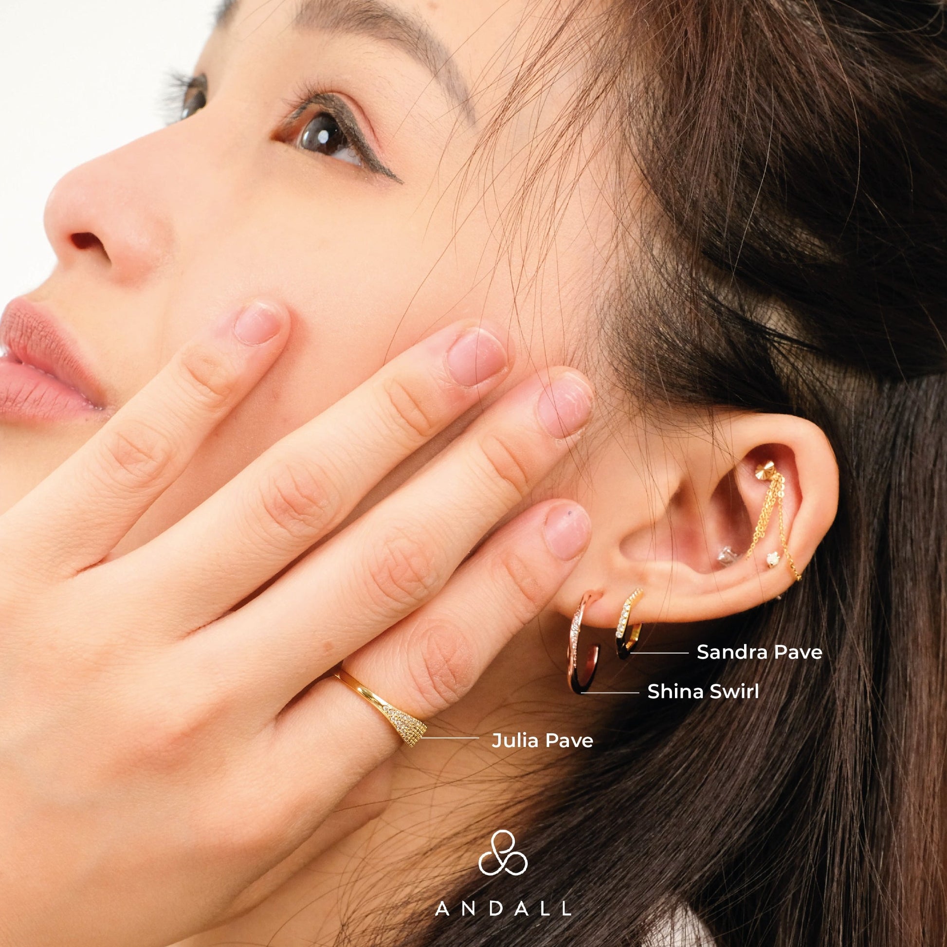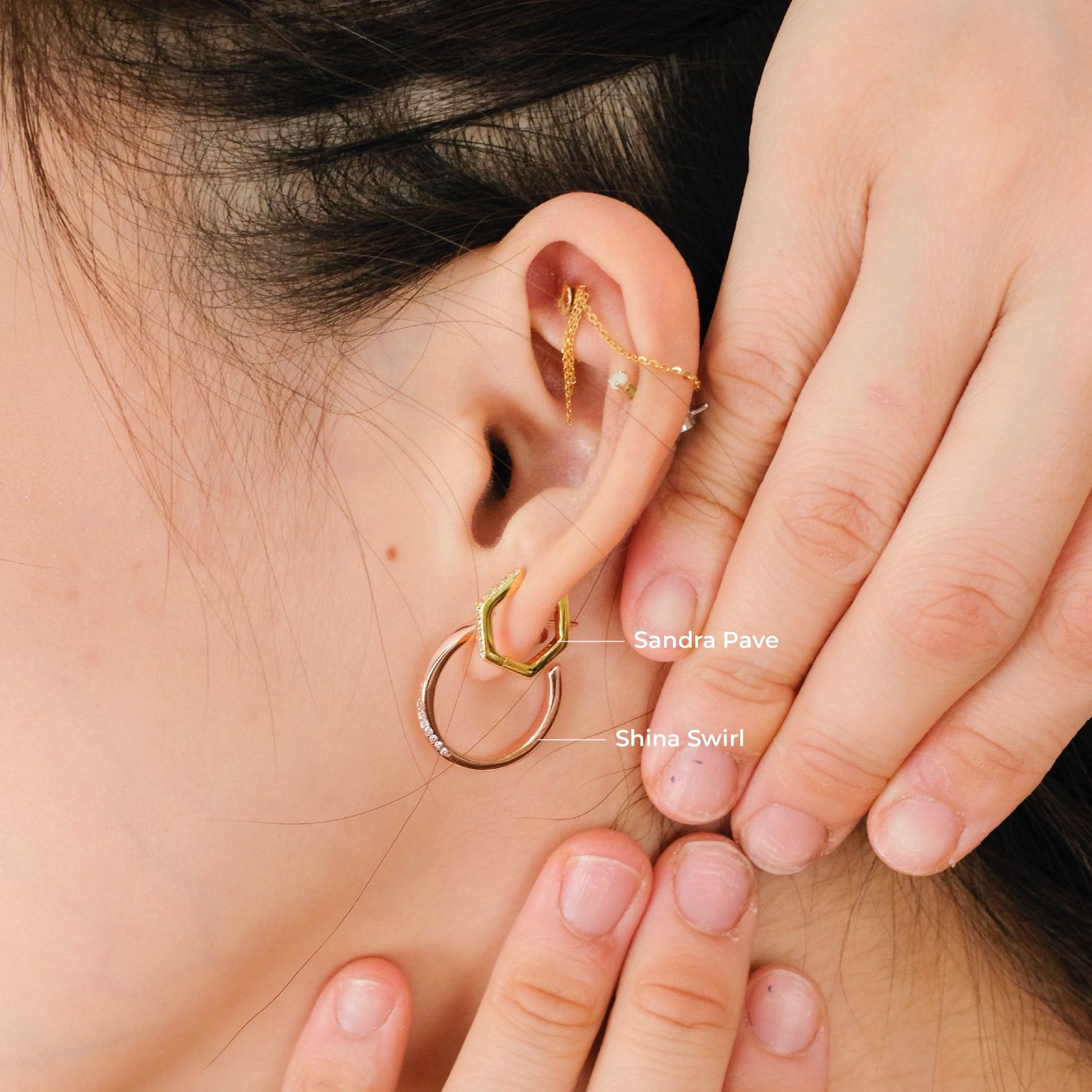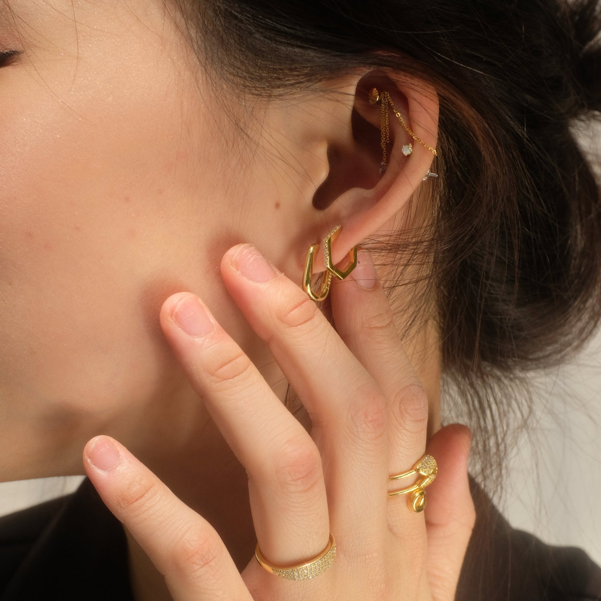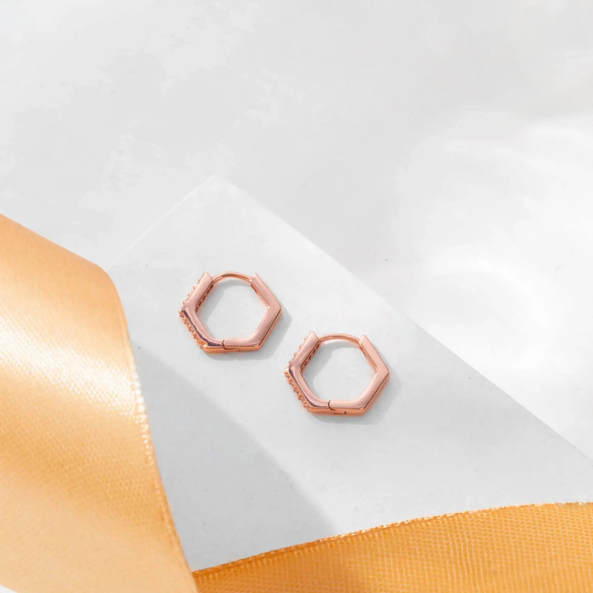 These modern sparkling hoops feature 11 Cubic Zirconia stones for timeless elegance. Contemporary and lightweight, these hexagon hoops are a must-have. Handcrafted in 925 Sterling Silver and layered in 18K gold, these geometrical hoops will add an extra sparkle to timeless elegant hoops.