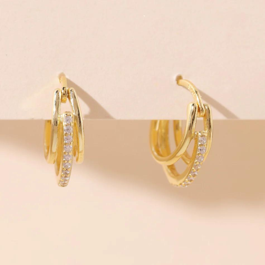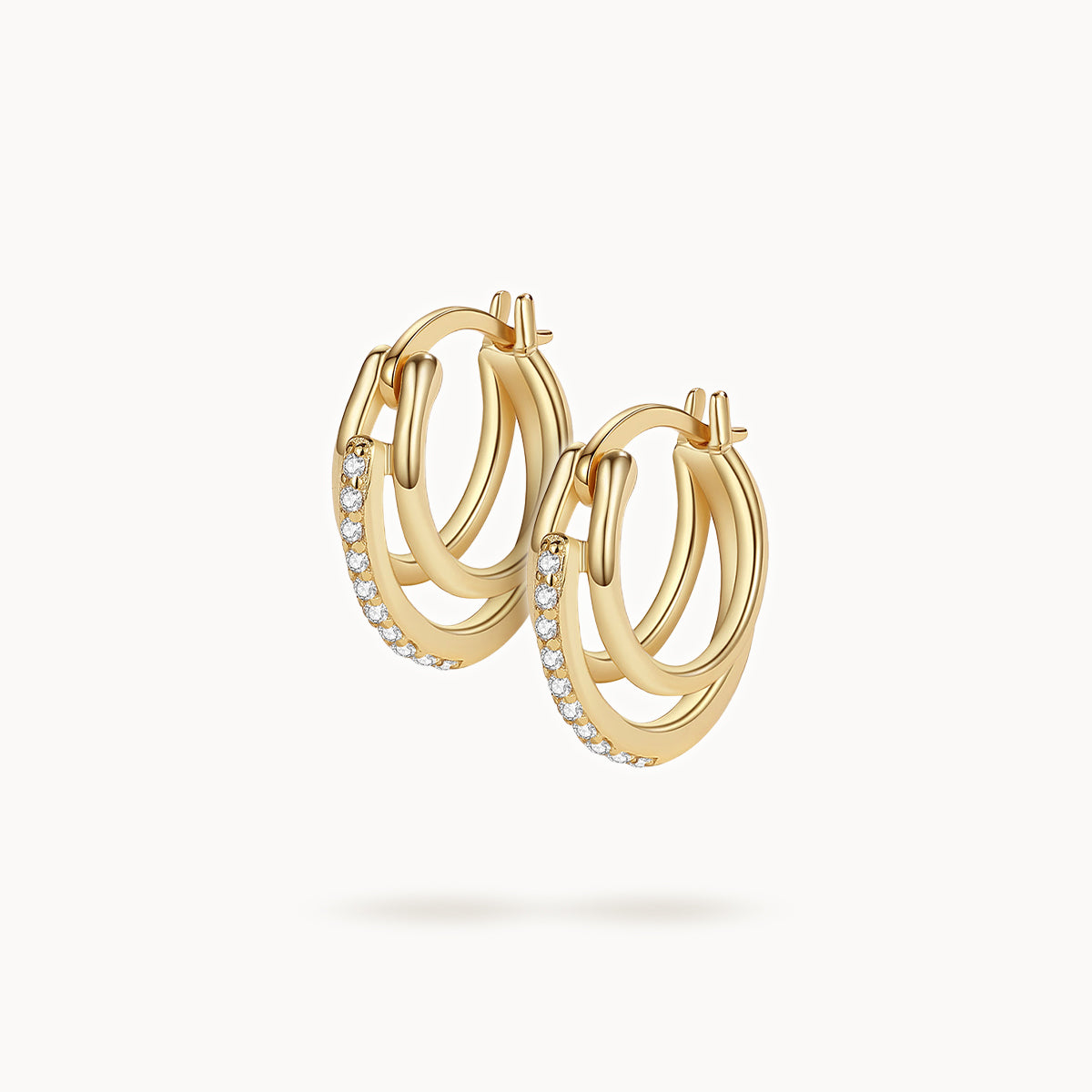 Get a triple-pierced look minus the commitment with these dainty, little triple hoop earrings. These triple huggie hoops are crafted in 925 sterling silver then finished in a layer of 18K gold and littered with cubic zirconia gems for some extra sparkle. Wear these double hoop earrings alone or pair them with a few gold studs for a modest ear stack. Feeling a bit bold? Opt for our best-selling Toda earrings.