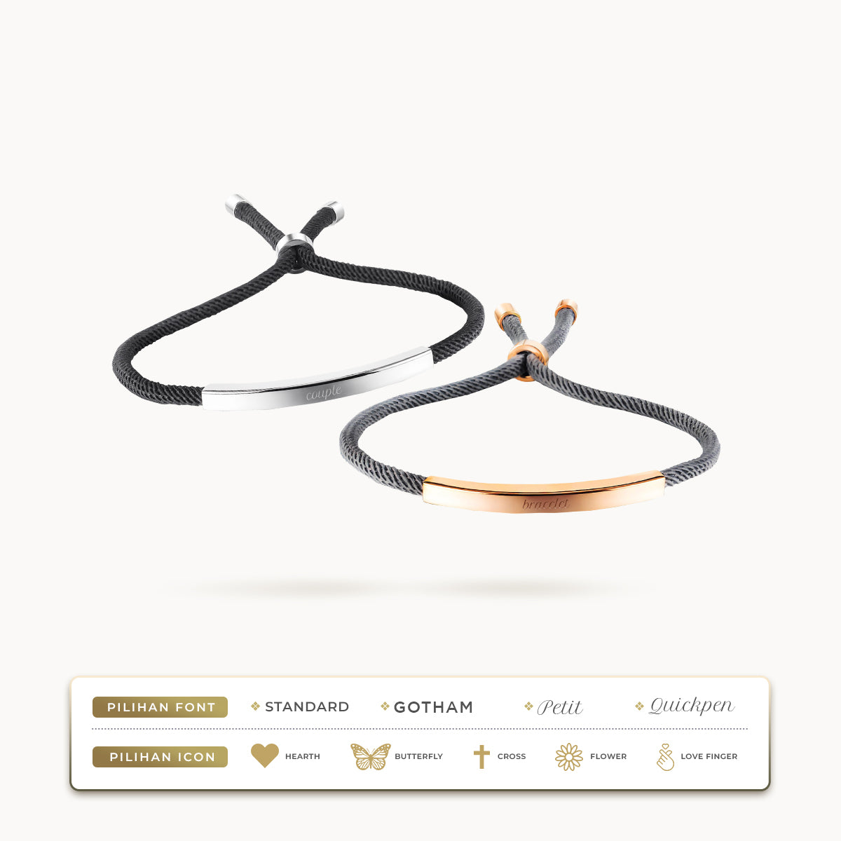 - If you'd like to engrave on both the front and back side, please indicate the respective designs [Front side (Name,Font,Icon) & Back side (Name,Font,Icon)]